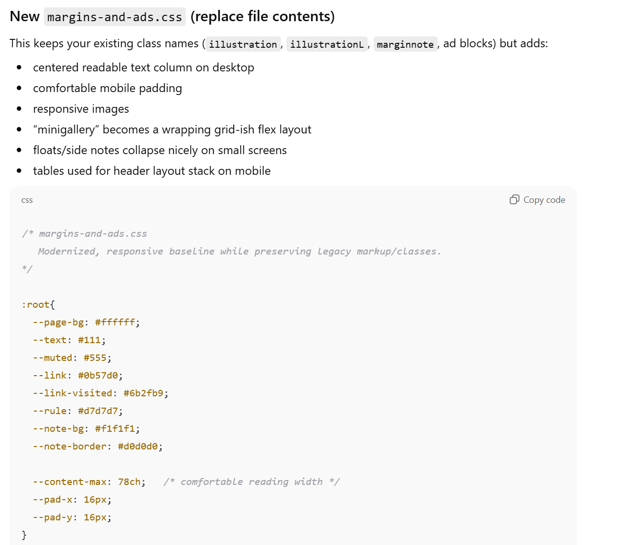 I want to update the CSS on a web site so that it renders nicely on mobile and, ideally, has an improved look on desktop as well. I’d like to not make too many changes to the HTML, though I could add a viewport meta tag in the head of every HTML file, for example. I’m going to upload four sample HTML files from this site and two CSS files that are referenced (margins-and-ads.css is the one that nearly all pages on the site reference). Please send me back new CSS and any changes that you think would be worth doing on all of the HTML pages on the site.