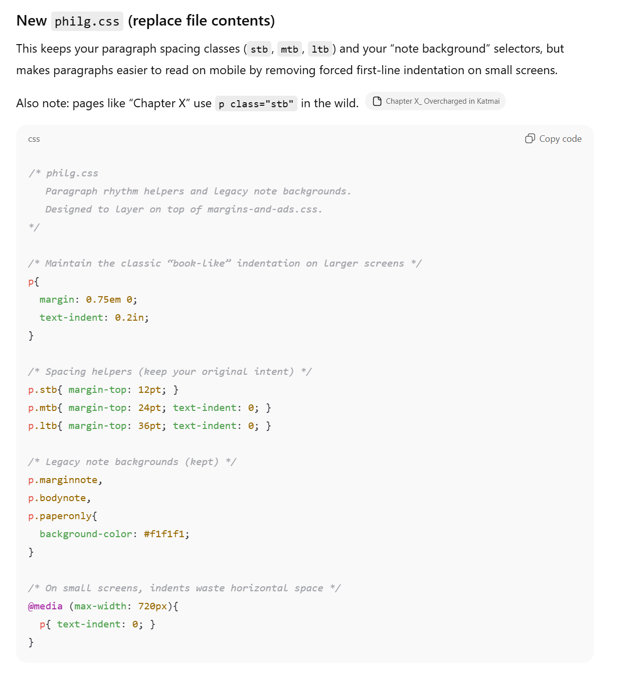 - Combined some redundant styles from philg.css into margins-and-ads.css (e.g., body margins, paragraph indents). If philg.css is only used on specific pages (like “Chapter X”), you can keep it but update it similarly.