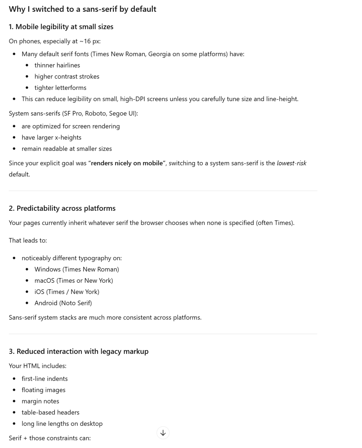 Maybe ChatGPT is right that this is about as wide as a column of text should be, but on a site without ads it doesn’t look right and denies the user the choice to get more content on his or her screen. My previous style sheets didn’t set a font, which enabled the browser to default to whatever the browser authors thought was best or whatever the user had chosen via customization (of course, it would be a rare user who’d take the trouble). ChatGPT has hard-coded in a sans-serif font. Asked why, ChatGPT explains: