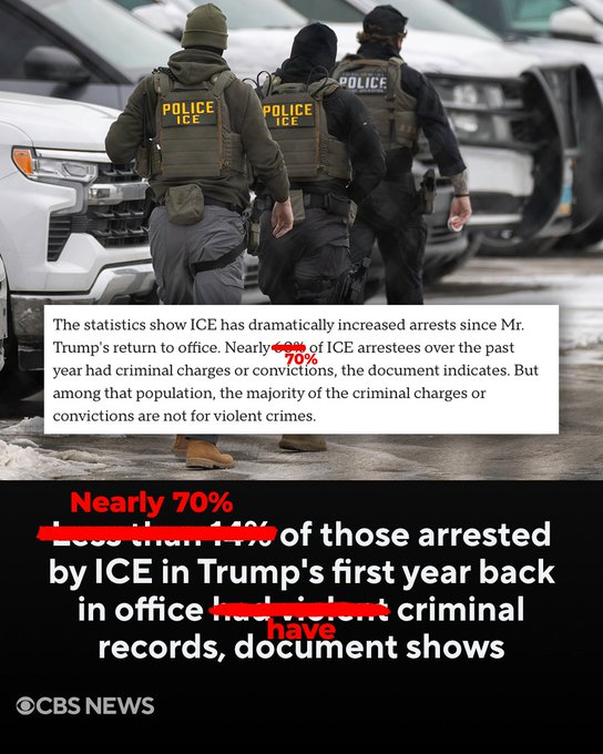 Less than 14% of nearly 400,000 immigrants arrested by Immigration and Customs Enforcement in President Trump’s first year back in the White House had charges or convictions for violent criminal offenses, according to an internal Department of Homeland Security document obtained by CBS News. … Nearly 60% of ICE arrestees over the past year had criminal charges or convictions, the document indicates. But among that population, the majority of the criminal charges or convictions are not for violent crimes.