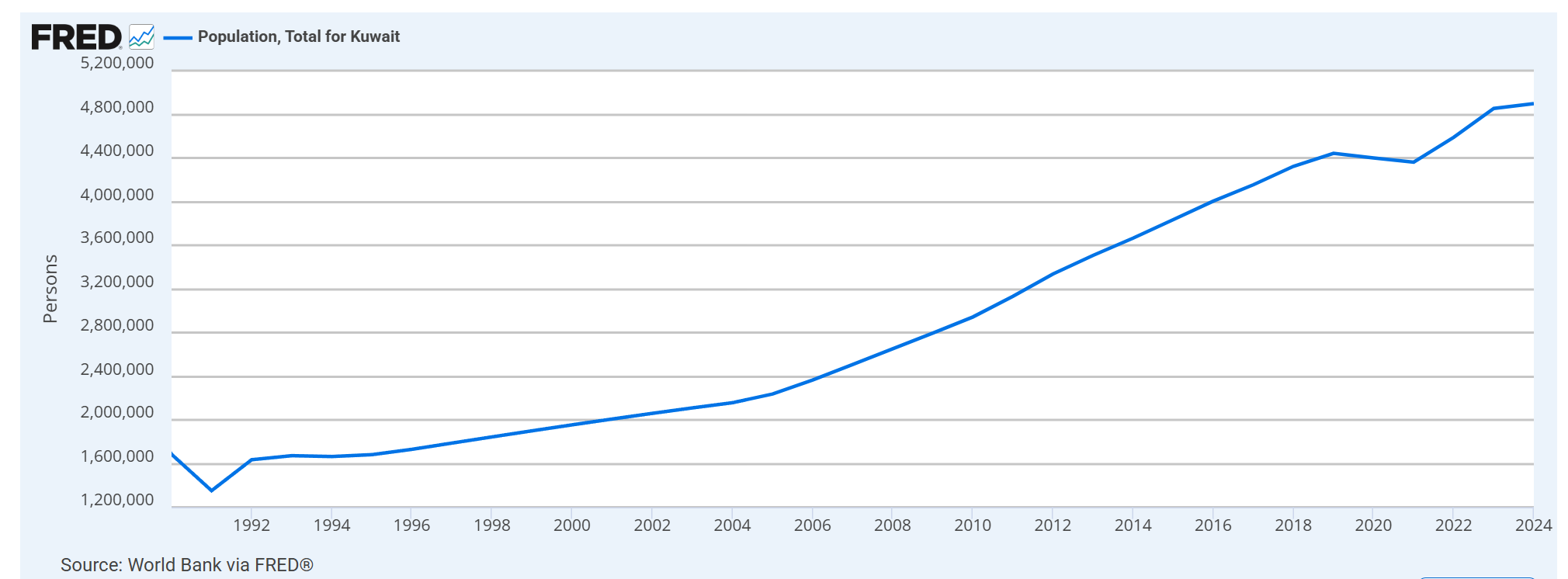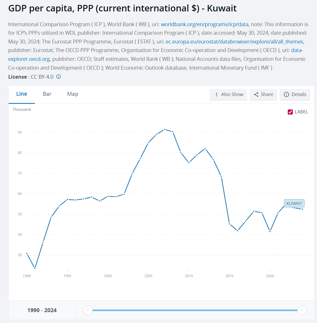 Let’s check in on a petrostate that has been shooting down U.S. fighter jets recently. Kuwait is rich, though not quite as rich per capita as it once was. It looks like they’ve grown the denominator via population growth and, thus, each individual’s share of the oil income has been reduced.