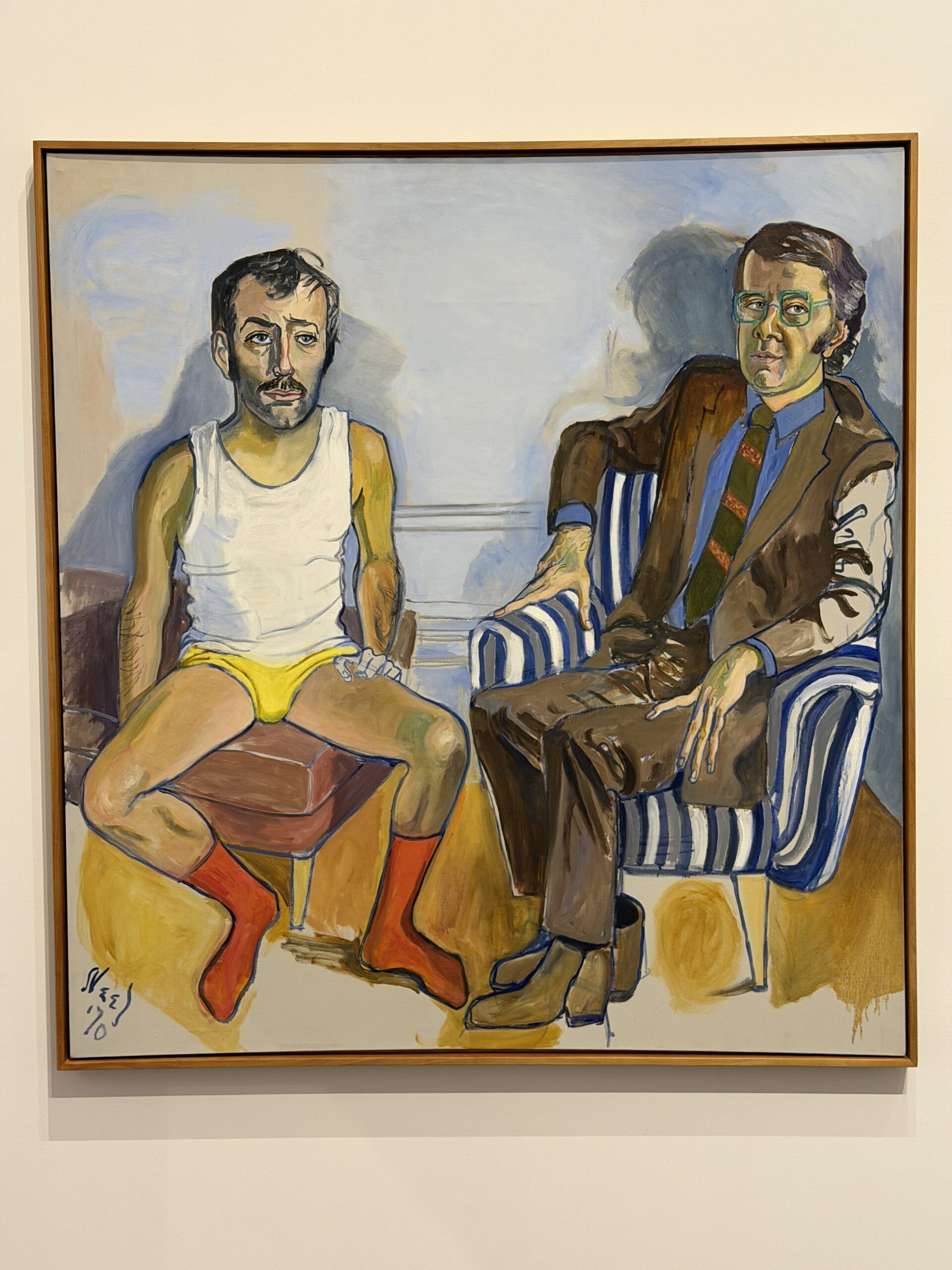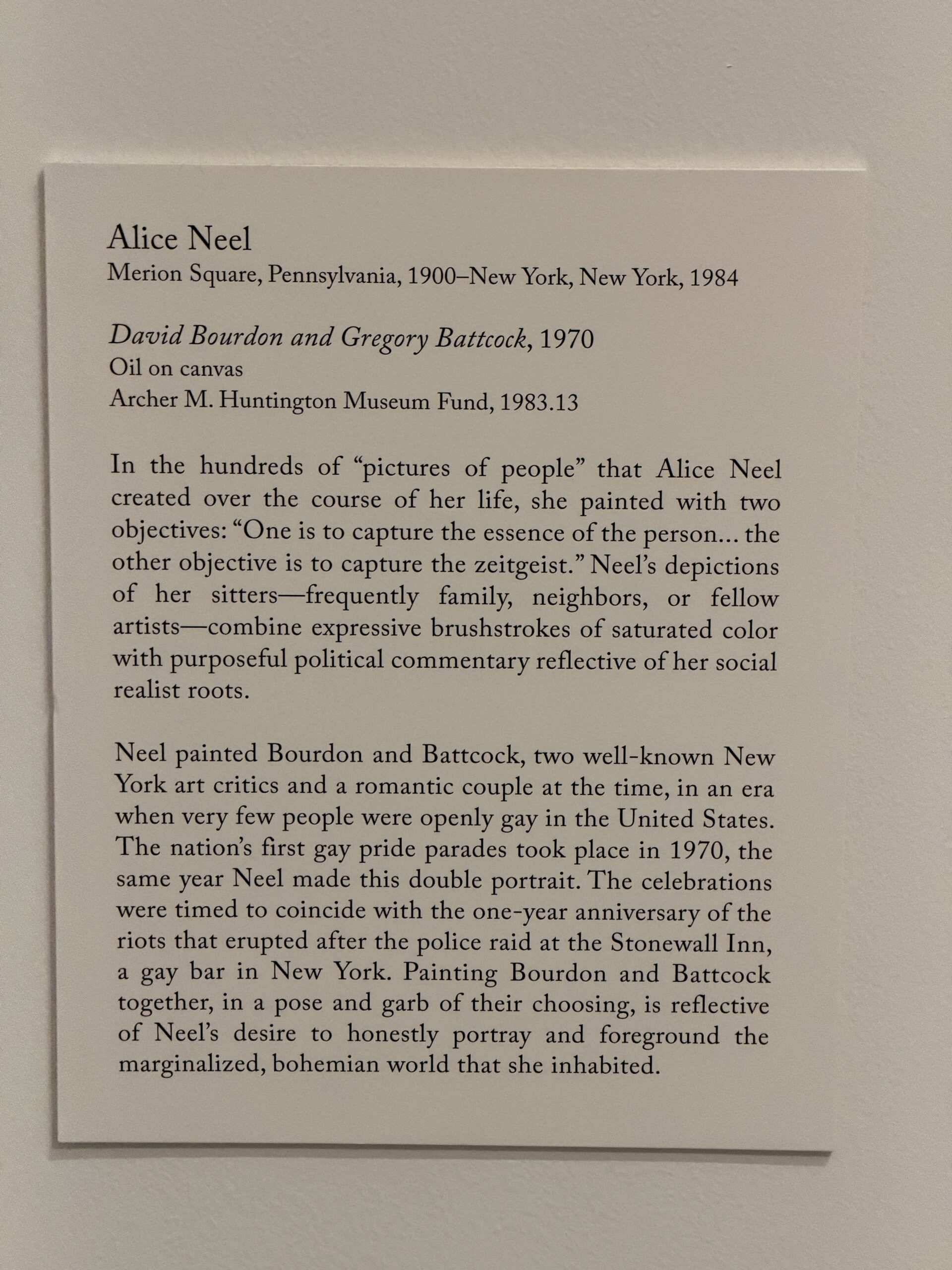 The 2SLGBTQQIA+ community is victimized and “marginalized”. Sign: “Neel painted Bourdon and Battcock, two well-known New York art critics and a romantic couple at the time, in an era when very few people were openly gay in the United States.” In other words, they were hated so much that they were forced to make a living by getting checks from publishers for their opinions about art and they were denied the opportunity to work in a widget factory. According to Wikipedia, Gregory Battcock “was murdered at his vacation home in San Juan, Puerto Rico on December 25, 1980. The murder remains unsolved”. The marginalization of David Bourdon was so extreme that “he served as an editor at Life from 1966 to 1971, associate editor at Saturday Review from 1972 to 1974, senior editor at Geo from 1981 to 1983, and senior features editor at Vogue from 1983 to 1986. He was also The Village Voice’s art critic from 1964 to 1966 and 1974 to 1977.”