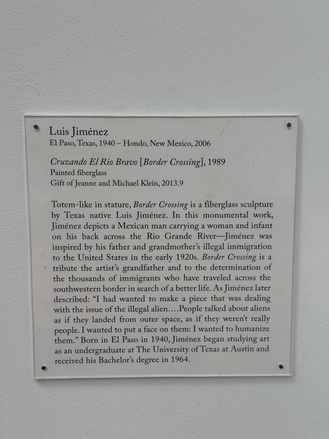 Migrants are celebrated with a larger-than-life statue: “Border Crossing is a tribute the artist’s grandfather and to the determination of the thousands of immigrants who have traveled across the southwestern border in search of a better life.” From the artist: “People talked about aliens as if they landed from outer space, as if they weren’t really people. I wanted to put a face on them: I wanted to humanize them” (isn’t it the very humanity of immigrants that makes them destructive to the American working class? Because they’re human they compete for housing, jobs, and welfare dollars)