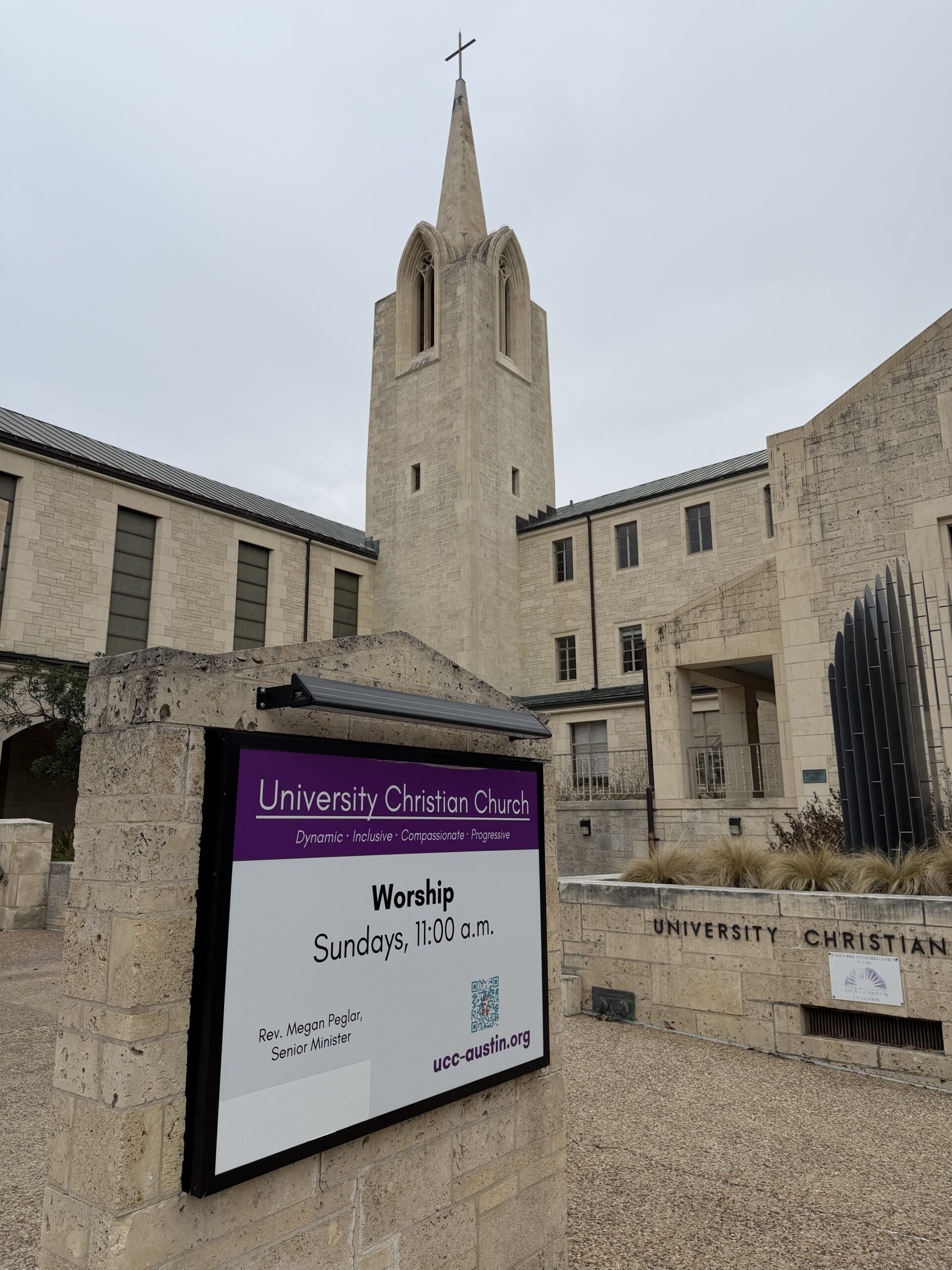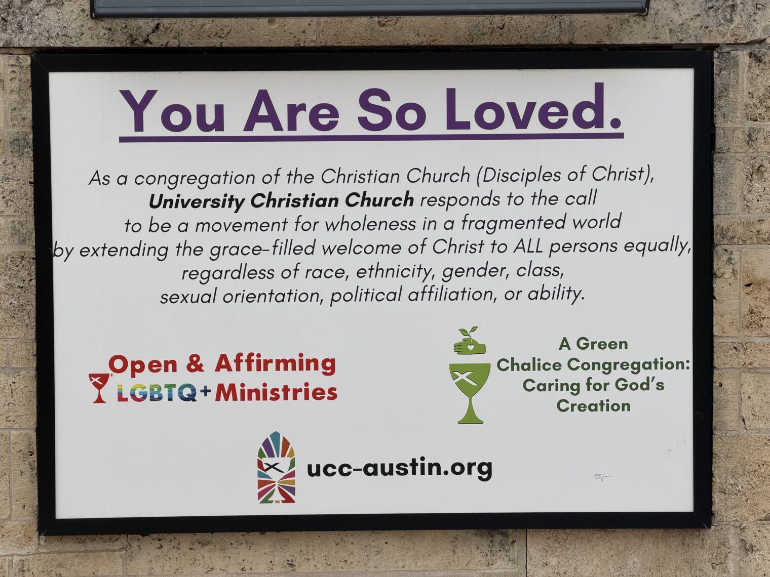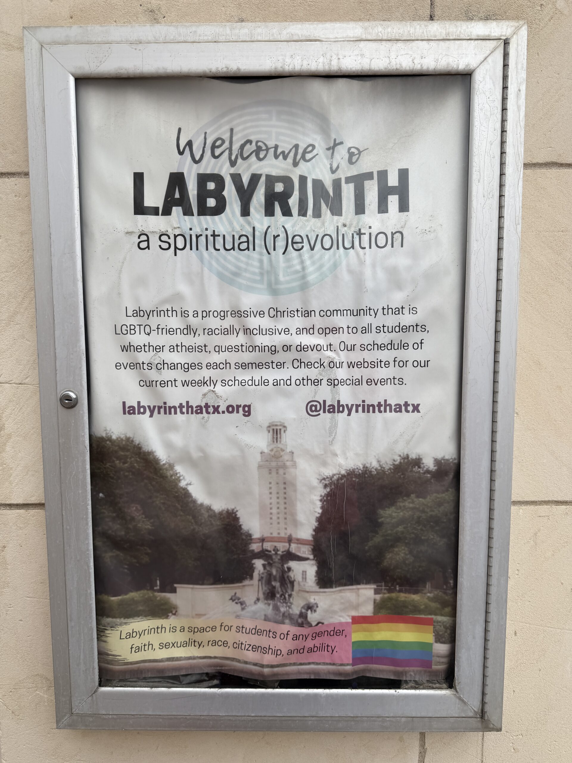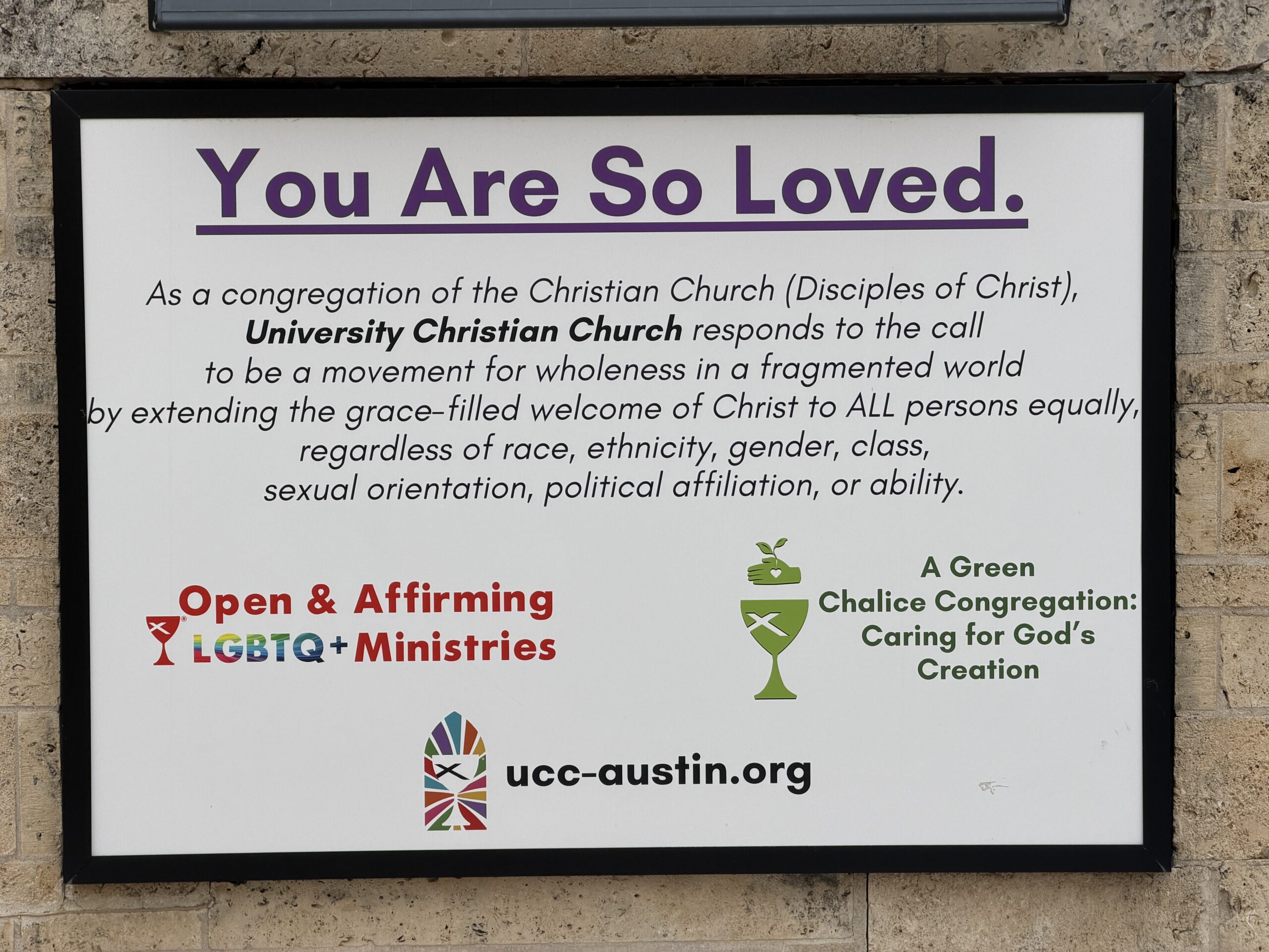 Speaking of morals, an on-campus church reminds visitors that “atheist” and Rainbow Flag worship are part of a “Christian community”: