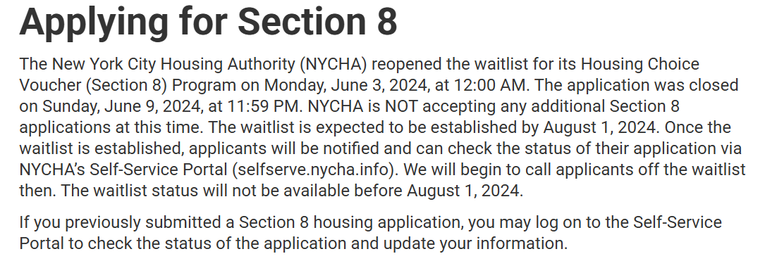 Let’s assume that AI/robotics renders only about half of the U.S. workforce unemployable (we’ll keep our high minimum wages so anyone with below-median skills, health, beauty, or strength won’t be able to work legally). That means there will be a gradual, but huge, increase in demand for taxpayer-funded housing (public housing or Section 8). Even before ChatGPT was launched (November 2022), there was already a long waiting list for a taxpayer-funded apartment and, oftentimes, the waiting list was so long that authorities closed. Here’s a March 4, 2026 snapshots from New York City’s taxpayer-subsidized housing web site: