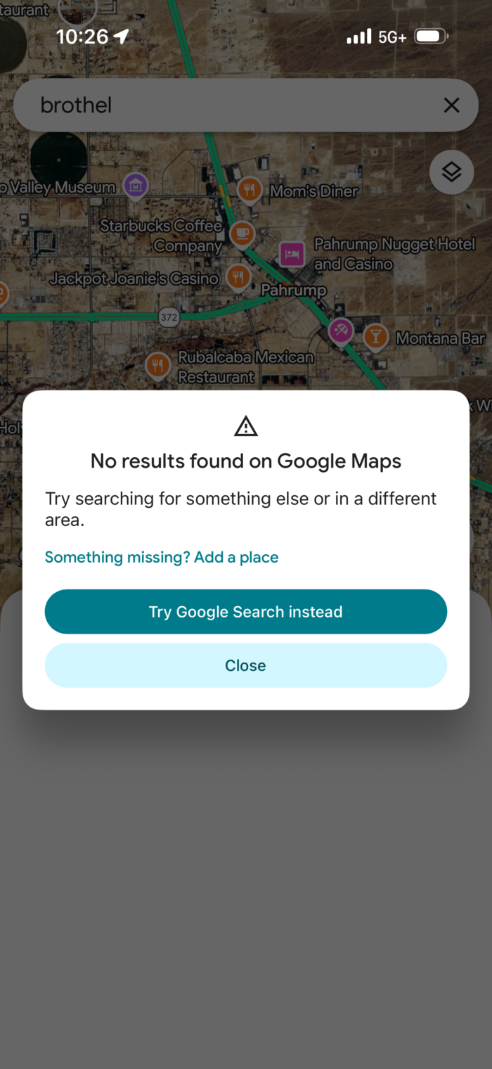 Enterprise in Pahrump is awesome and came out to fetch us far faster than the airport folks could bring over a fuel truck. Navigating to the most famous Pahrump establishments is challenging because Google Maps at first claims that they don’t exist: