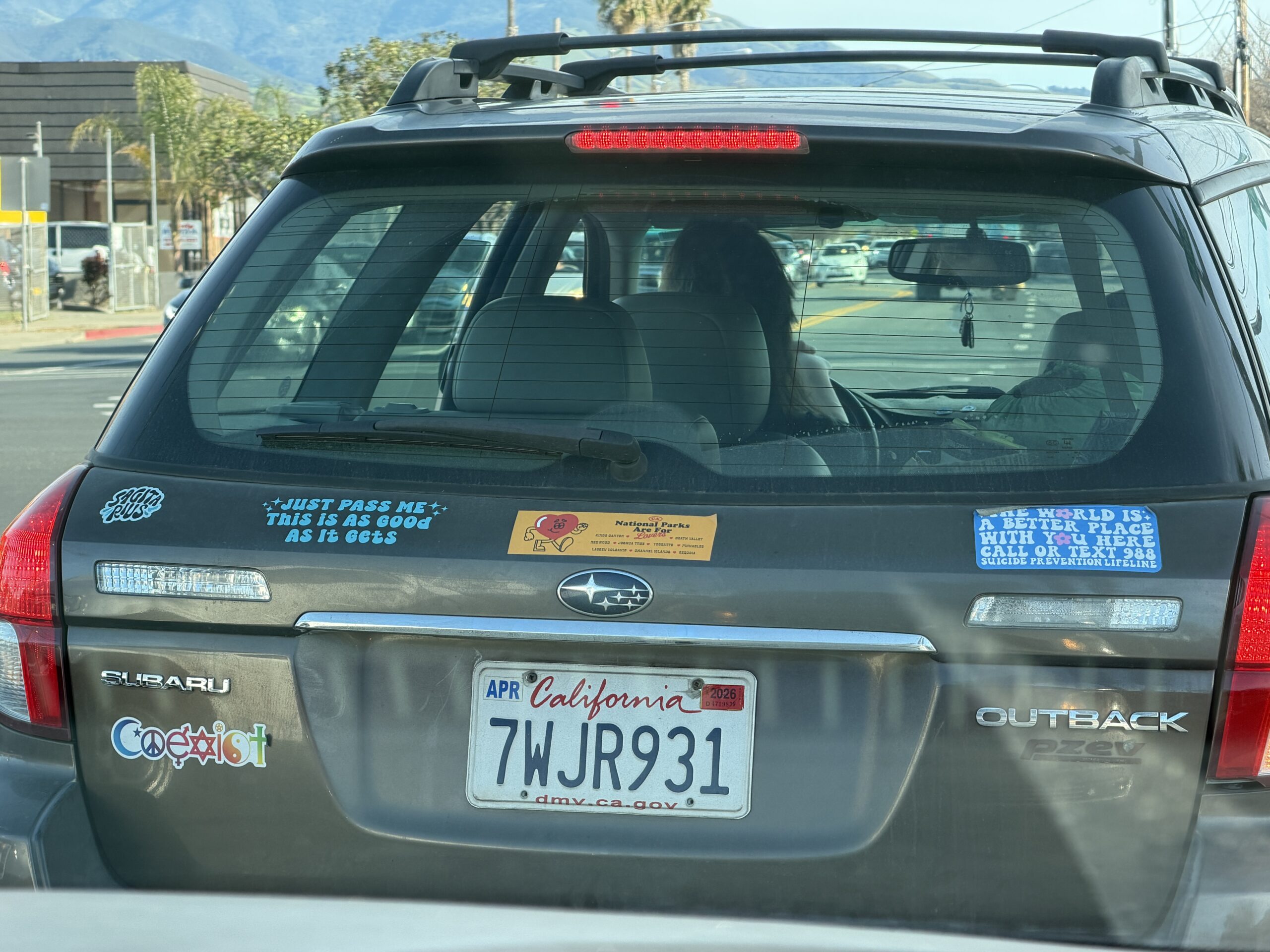 … we landed in Concord, California, rode on “Transforce” tires, were admonished to “Coexist” with people of different religions, and arrived at a Thai restaurant with an all-gender restroom: