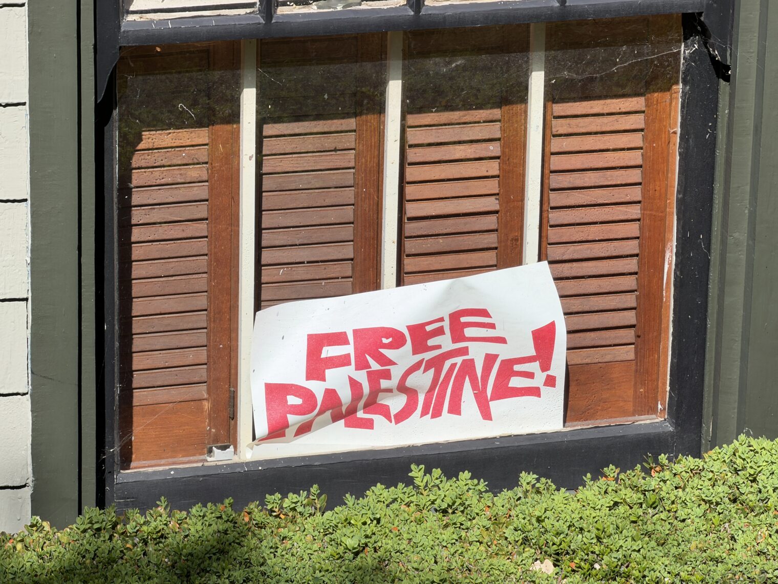 Two yards over, “Free Palestine” (this was a day before Donald Trump attacked the peaceful Iranians so the signs in support of the Islamic Republic hadn’t gone up yet):