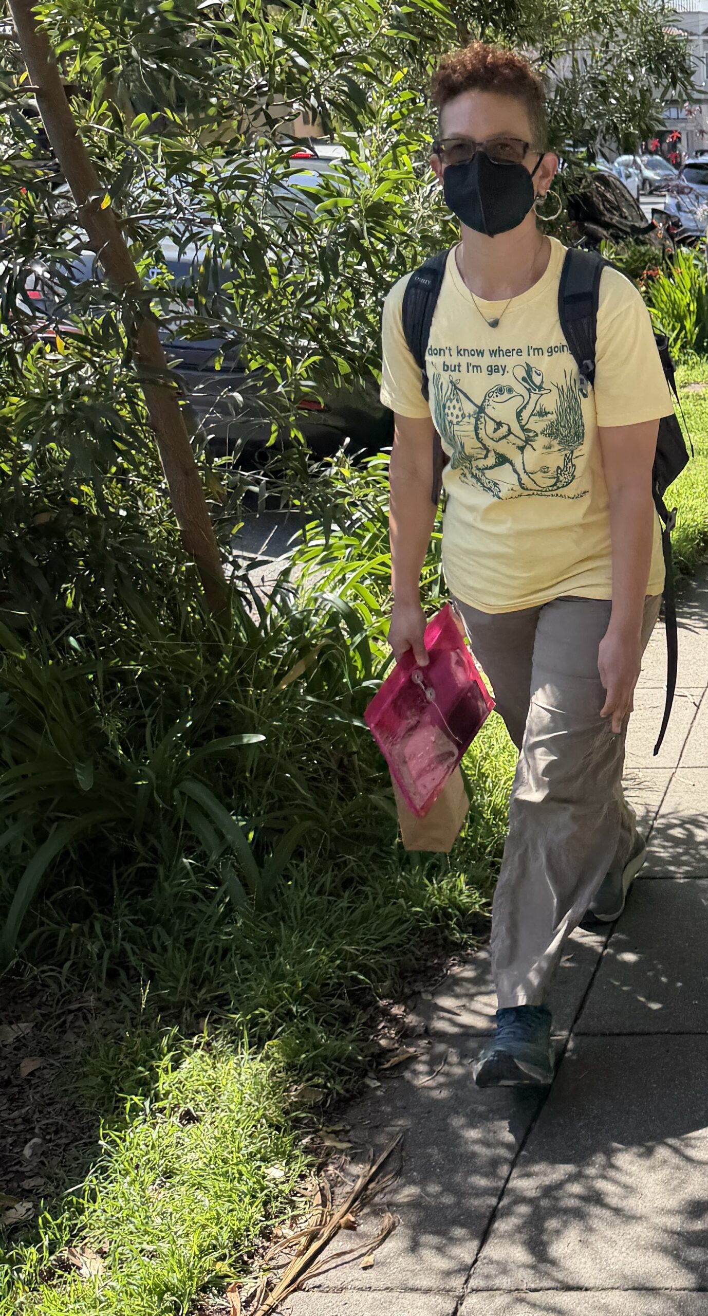 Outdoor masking is common and so is wearing an “I’m gay” t-shirt, but it was relatively rare to find an intersection: