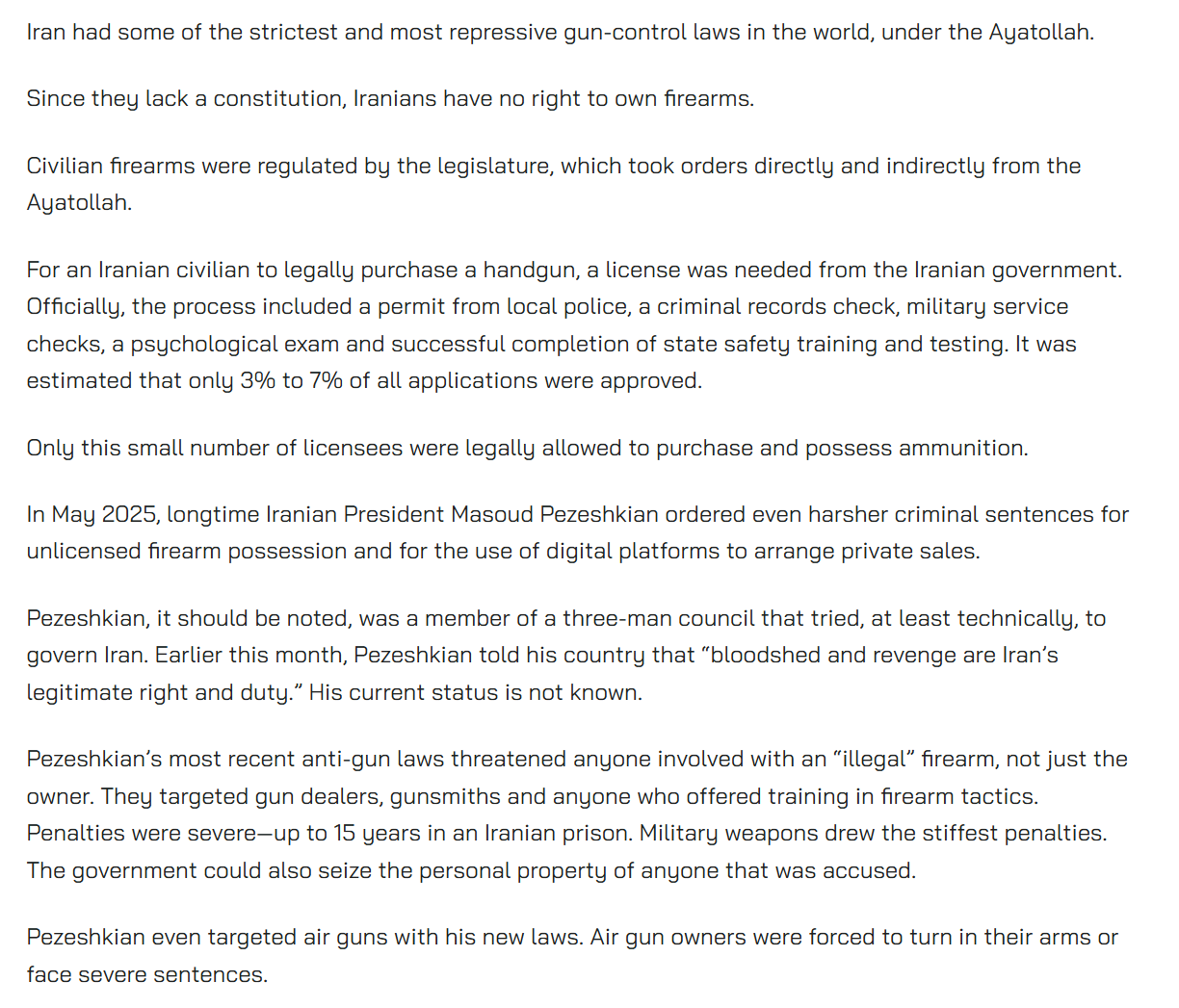 It seems that very few Iranians could shoot their way out even if motivated to do so. The Islamic Republic has a near-monopoly on gun ownership that is enforced by a Chicago or New York Democrat’s dream common sense gun control system: