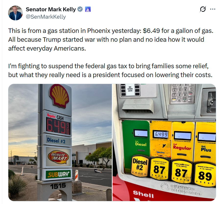 The same Democrat, March 24, 2026, demands low gasoline prices so that Americans will be encouraged to buy 12 mpg SUVs and drive in circles. The most obvious way to reduce carbon emissions is a carbon tax, but Sen. Mark Kelly here advocates removing a carbon tax (that also pays to maintain the roads, thus shifting the tax burden for road maintenance from car owners to people who virtuously live in walkable neighborhoods and don’t use cars):