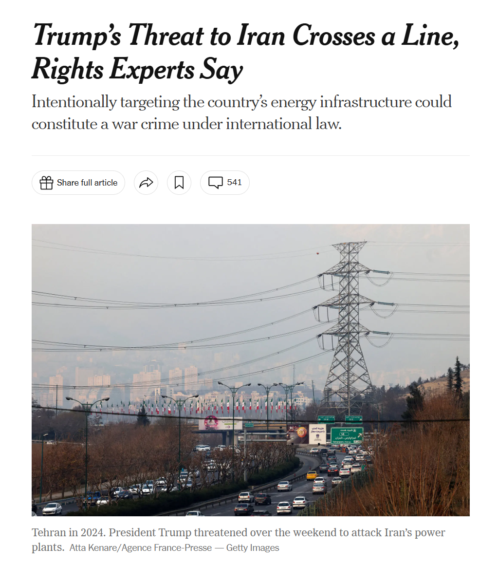 The same newspaper that implies it was not a crime for us to disable Cuba’s electric power says that it would definitely be a “war crime” to do anything to harm our actual enemy, Iran. NYT, March 24, 2026: