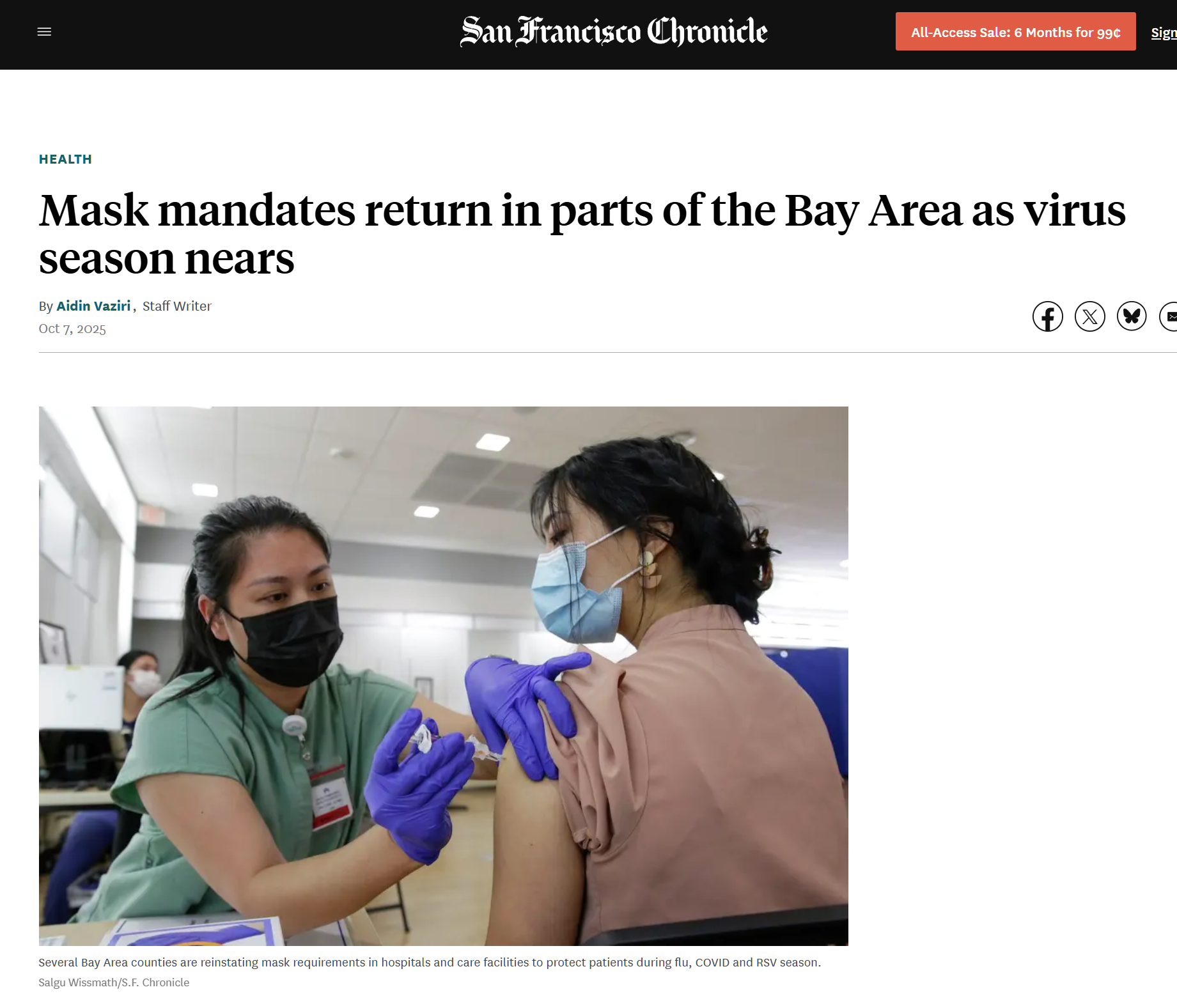 Mask requirements are returning to health care settings across parts of the Bay Area, as local health officials brace for the annual surge in respiratory illnesses – including COVID-19, influenza and RSV – that typically arrives with colder weather.