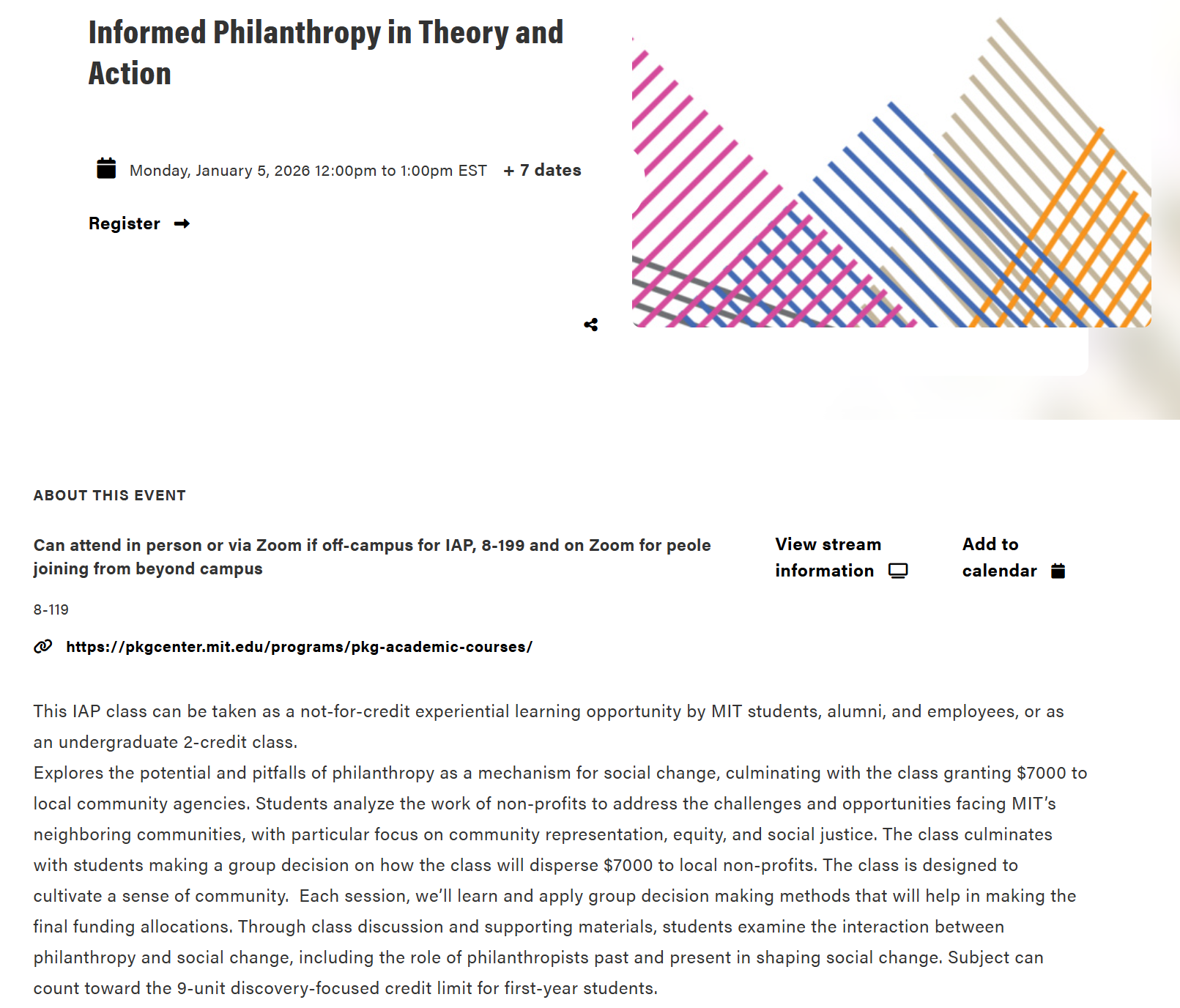 Let’s look at the first class on Informed Philanthropy: “Students analyze the work of non-profits to address the challenges and opportunities facing MIT’s neighboring communities, with particular focus on community representation, equity, and social justice”. Imagine raising one’s hand towards the end of the class and saying, “Cambridge is critically short of affordable housing and health care. Therefore, in order to advance social justice for those whose ancestors were slaves in the U.S., we should give the $7,000 to ICE so that they can deport all of the undocumented migrants who are living in Cambridge public housing, contributing to long waiting lists to see doctors, and driving up food prices with their SNAP/EBT cards.”