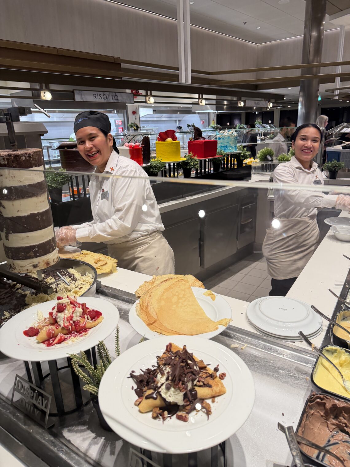 (Why did Celebrity put up a sign labeling these “shawarma” rather than “crêpes”? It’s true that the legacy white Christian French population contributed the underlying pancake, but they also had a chocolate wheel from which shavings were being made.)