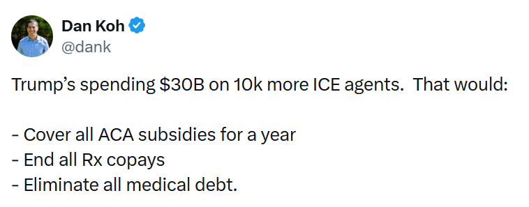 The Harvard MBA is off by a factor of about 30X, according to ChatGPT. The ICE funding, even if it were $30 billion per year, wouldn’t begin to cover just the first item on Koh’s list (ACA subsidies).