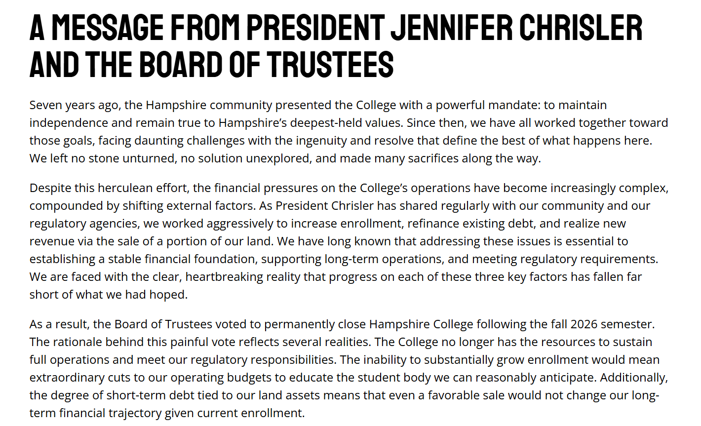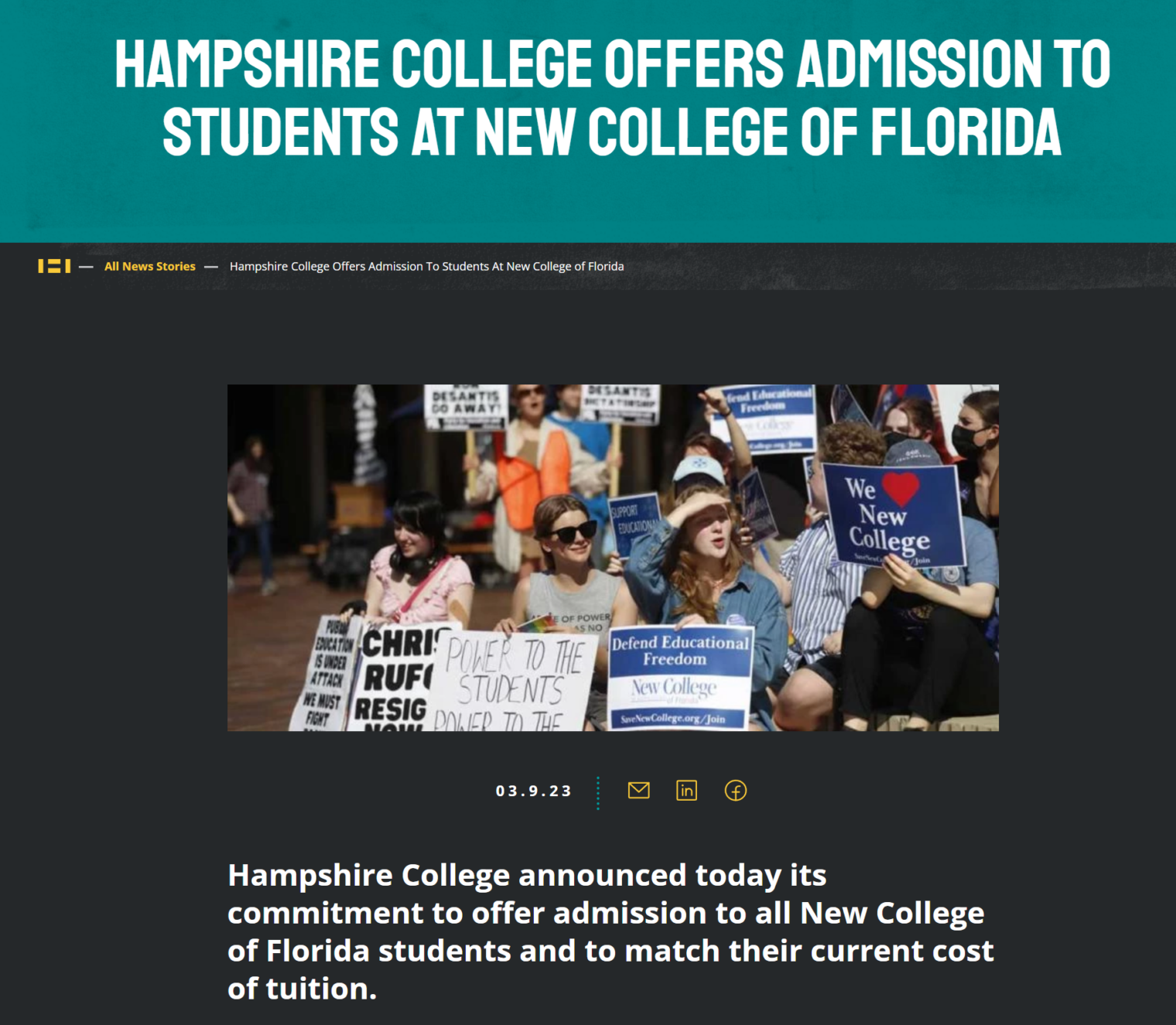 Hampshire College announced today its commitment to offer admission to all New College of Florida students in good standing and to match their current cost of tuition. This opportunity is in response to the continuing attacks on New College of Florida intended to limit intellectual exploration, turn back progress toward inclusion, and curtail open discussion of race, injustice, and histories of oppression. By committing to impose a narrowly politicized curriculum on New College, the newly appointed trustees broke promises made to its current students to support a self-directed, rigorous education grounded in a commitment to free inquiry.